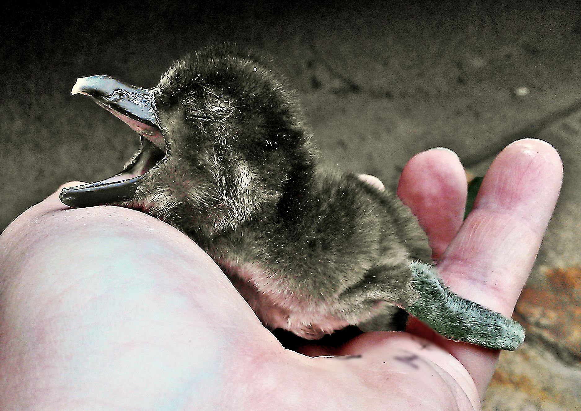 When they hatched, both penguin chicks were only a little bigger than a golf ball in size, weighing less than a quarter of a pound. At first the chicks were nourished by the yolk sac inside their abdomens, which also contains important maternal antibodies, but within a couple of days, the parents were feeding them a rich diet of partially digested fish. Because newly hatched penguin chicks can’t regulate their own body temperatures, for the first few weeks they are continuously brooded (kept warm) by one of the parents.
