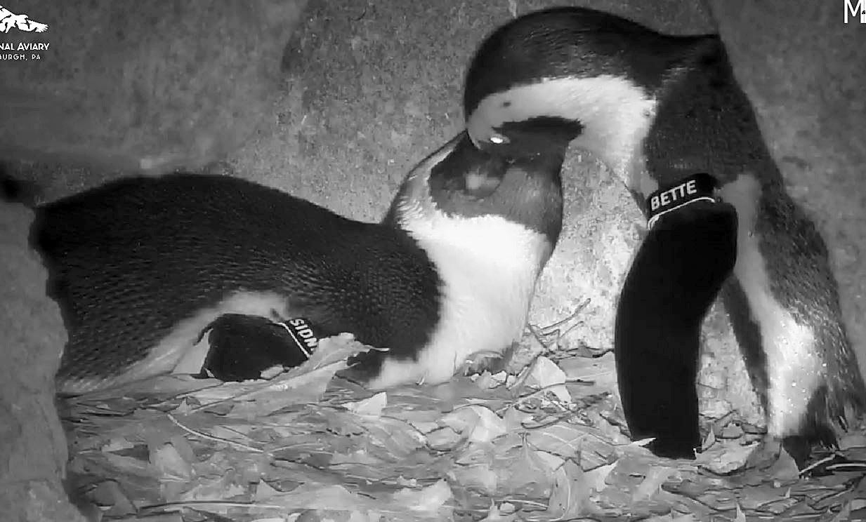 Last week Sidney and Bette, a nesting pair of African penguins at the National Aviary, had their third successful nesting in as many years. African penguins are monogamous and remain mated for life, which can be 25 years or more in captivity. Sidney and Bette’s latest clutch of two eggs hatched Dec. 15 and 18. For the first time, the public can watch our growing penguin family as it goes about its business in a private nesting burrow, thanks to a high-resolution infrared nest camera donated and installed by M&P Security Solutions.